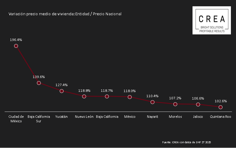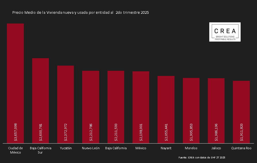 Al segundo trimestre del 2025 la SHF mostró en su reporte que el valor medio de la vivienda nueva y usada en Zacatecas fue menor a $1,100,000, mientras que, en entidades como Baja California, Baja California Sur, Nuevo León, Nayarit, Jalisco, CDMX, Estado de México, Morelos, Yucatán y Quintan Roo el valor medio de la vivienda fue mayor a $1,900,001.